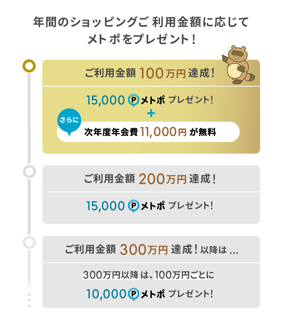 | ゴールドボーナスポイント | カードショッピングご利用年100万・200万達成時に15,000ポイント、年300万達成以後100万ごとに10,000ポイント |