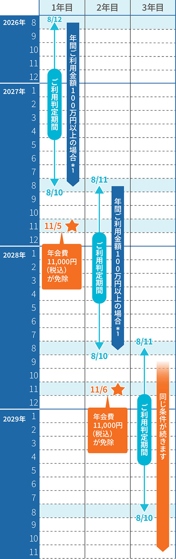 *1 判定期間内にカードのご利用金額が100万円(税込)を超えた場合、年会費は発生しません。永久不滅ポイント対象外のご利用は、年間ご利用金額には加算されません。