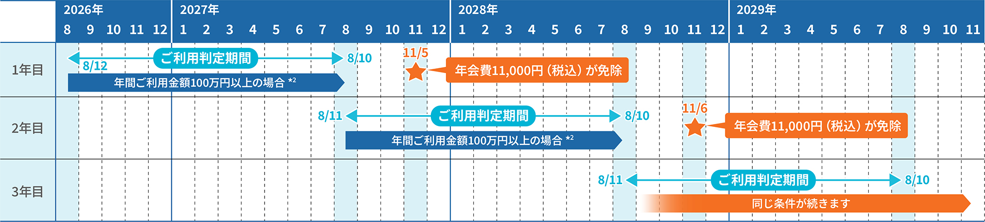 *2 判定期間内にカードのご利用金額が100万円(税込)を超えた場合、年会費は発生しません。永久不滅ポイント対象外のご利用は、年間ご利用金額には加算されません。